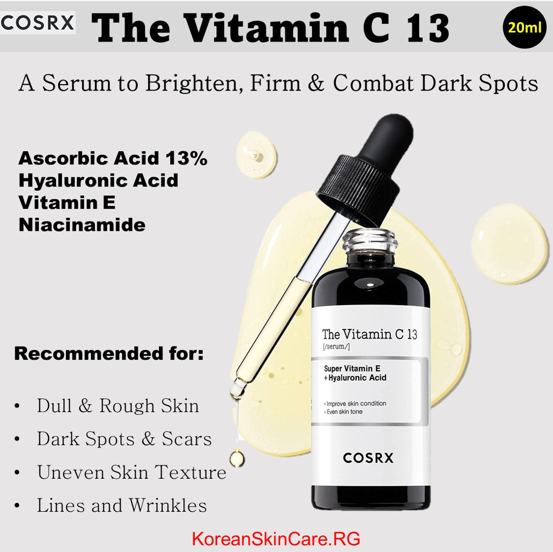 13% Pure Vitamin C (Ascorbic acid) helps achieve youthful glowing skin.